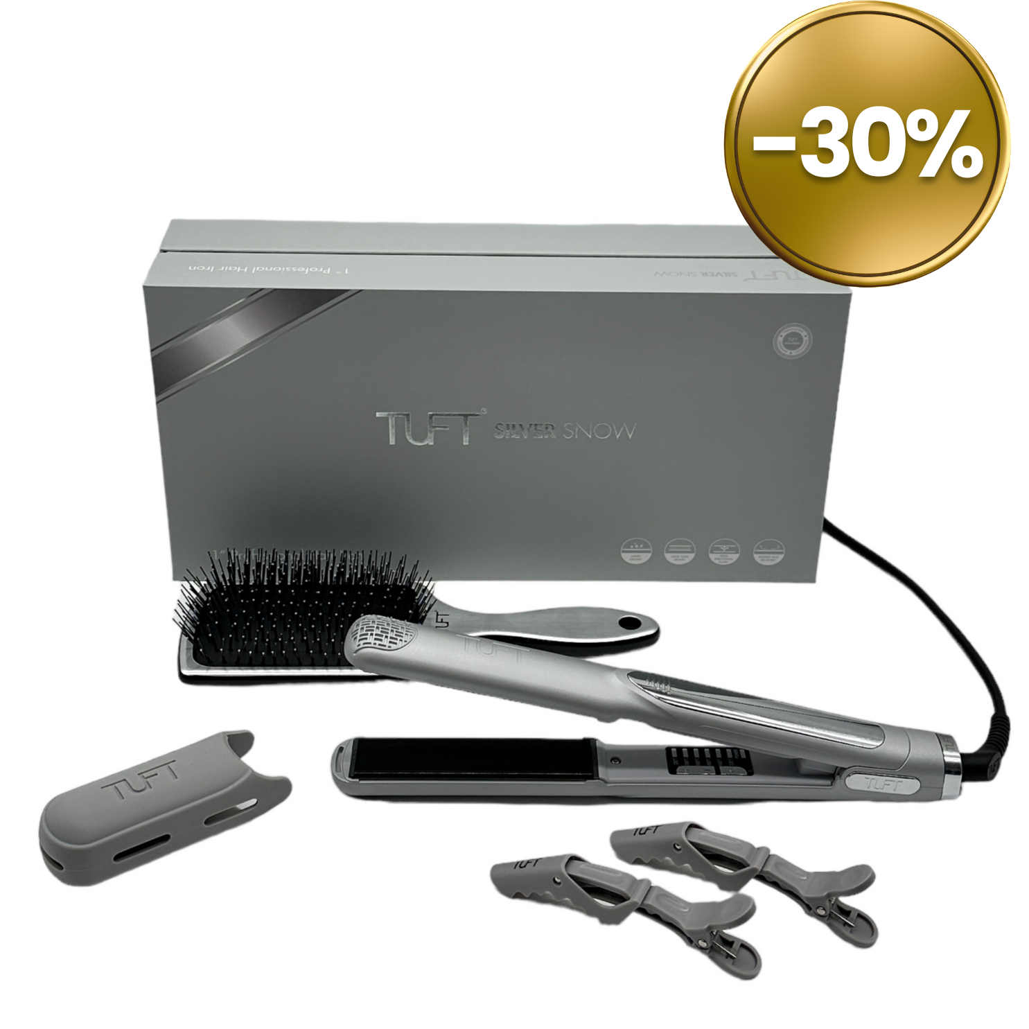 Il nuovo Silver Snow Set include la 1” Diamond Plus Styler, la nostra speciale Paddle Brush e 2 T-rex clip.